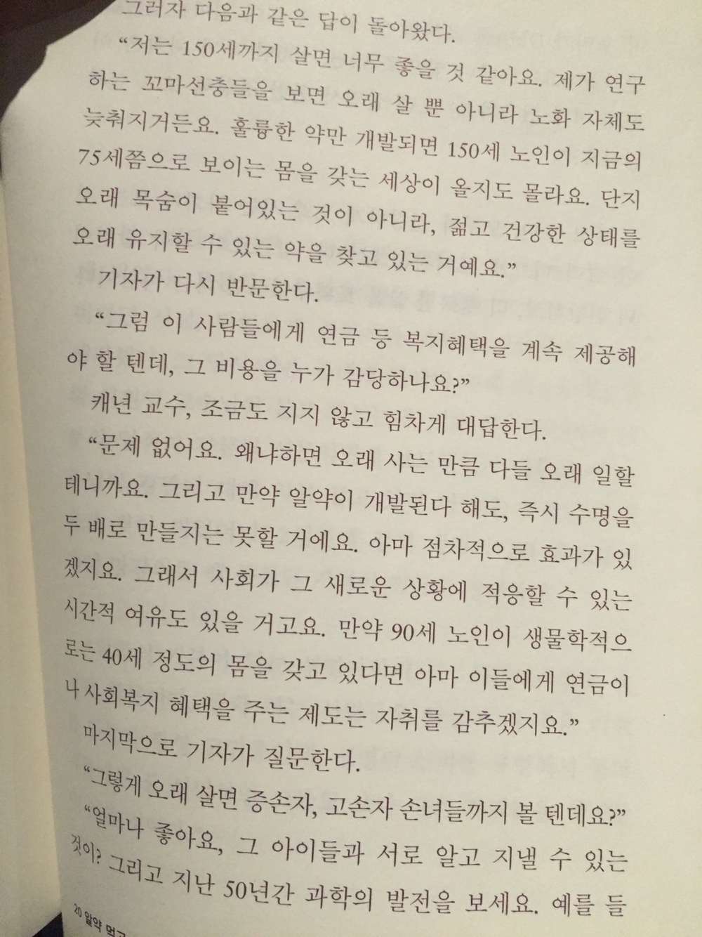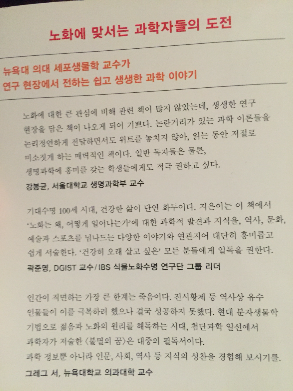 책은 뉴욕대 한국인 세포생물학자의 노화 이야기. 과학 발전은 슈퍼스타 몫이 아니라 학자들의 토론과 논쟁에서 나온다며 다양한 관련 연구를 소개해준다. 조금 어려운 대목들도 있지만 대중 눈높이로 애쓰셨다ㅎ